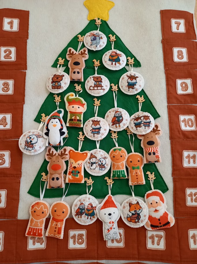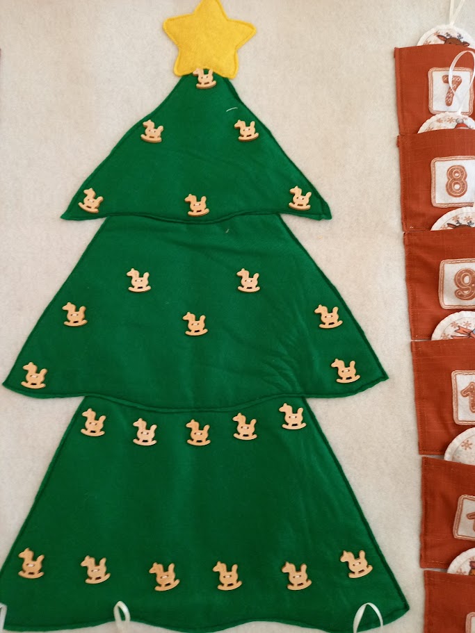 A fenyőfát naponként díszítjük fel, akasztóval gombra le- és felrakható figurákkal.